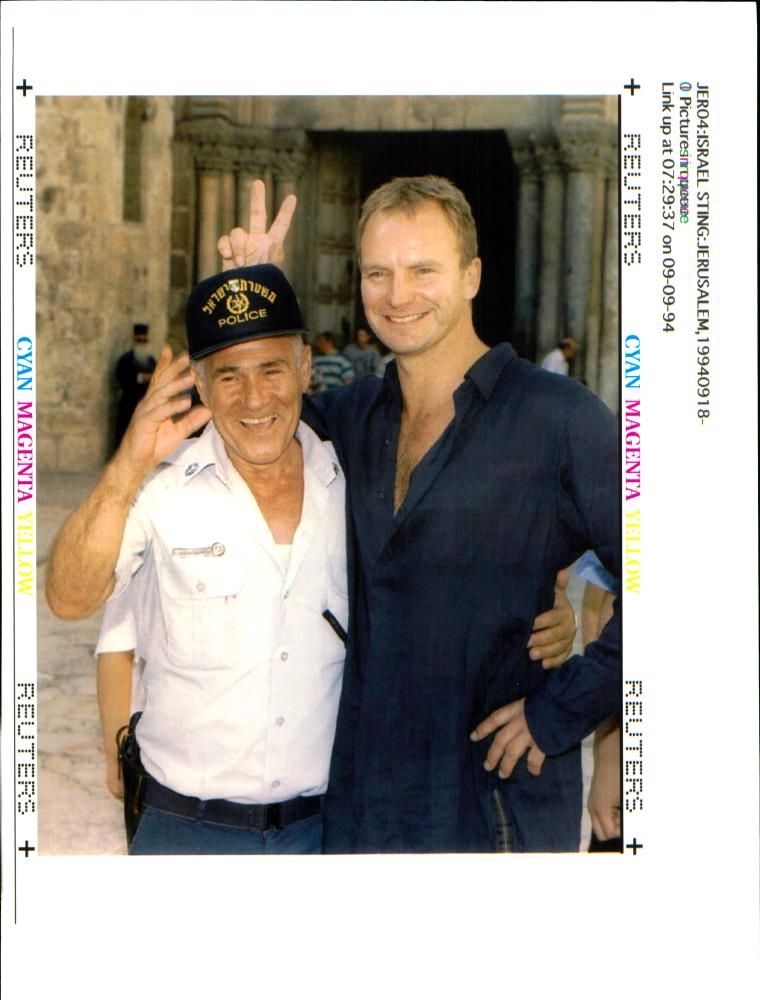 Photo with Israeli Police: During his 1994 visit to Israel, a photograph of Sting with an Israeli policeman in Jerusalem circulated, which some critics have interpreted as a sign of his lack of respect for Palestinians [32].